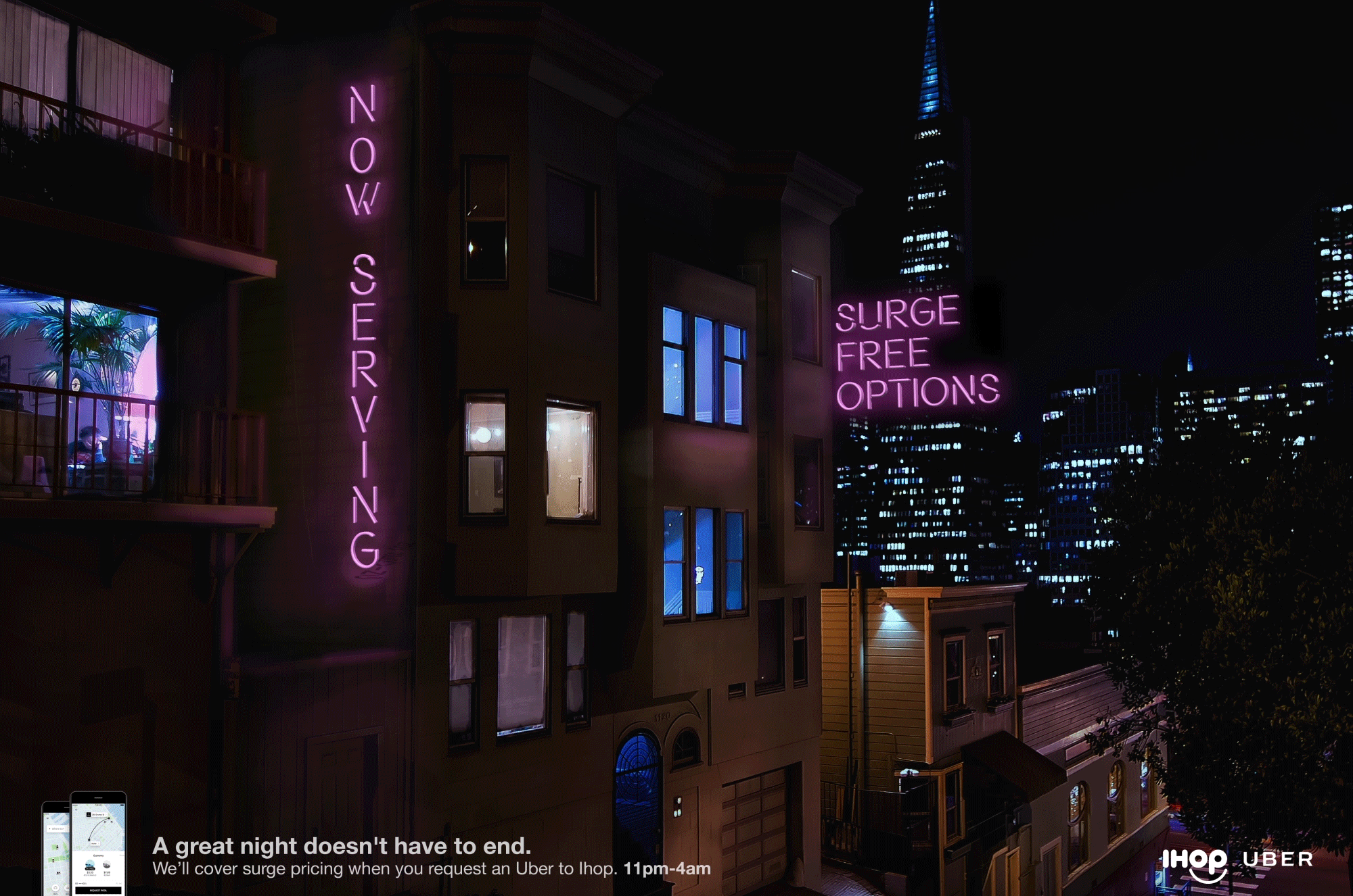 After a rousing evening out with pals, IHOP After Hours will disrupt Uber’s ludicrous surge pricing by offering the option of taking a car to the nearest IHOP. This option will not have surge pricing. The user will be asked if they would like to wait out the surge pricing with a late night snack.