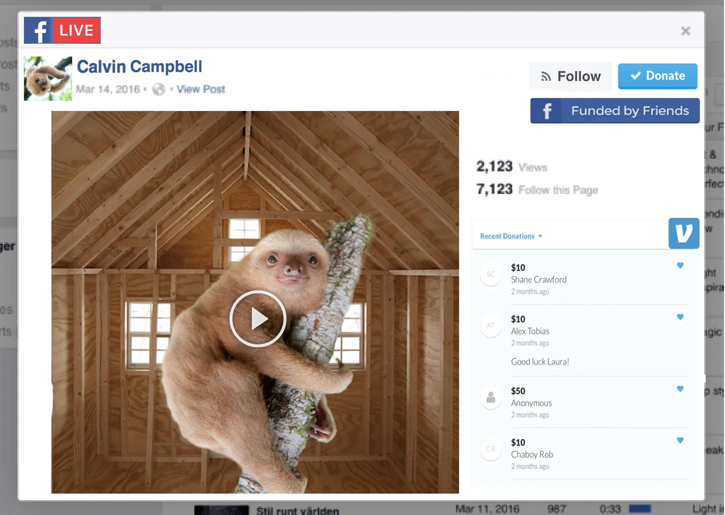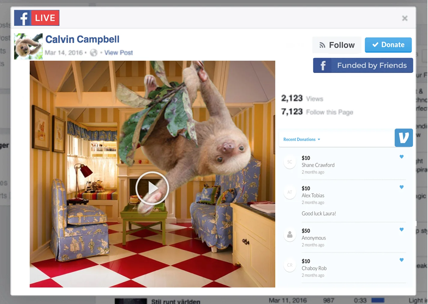 Facebook Live stream of Calvin the Sloth moving in to new unfurnished apartment. Calling viewers to help little Conor furnish his new place. All proceeds go towards WWF. Once donations are met viewers will get to see Calvin living large and happily in his posh new penthouse suite.